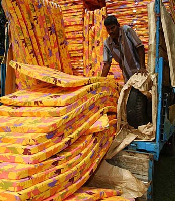 Un camión cargado con colchones es descargado en Matara, Sri Lanka, para que sean distribuidos entre los damnificados por el sismo y los maremotos del 26 de diciembre.