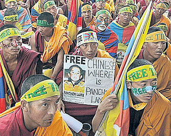 Monjes tibetanos budistas escuchan a un orador, durante una protesta en contra de China, en conmemoración de los 48 Días del Levantamiento Tibetano Nacional en Bangalore, India.