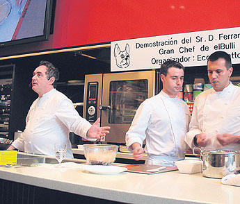 El cocinero catalán Ferrán Adriá (Izq), acompañado por cocineros del restaurante "El Bulli", durante una demostración de sus inventos culinarios en el anfiteatro de la prestigiosa Escuela de Cocina Hattori de Tokio (Japón).