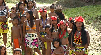 Las mujeres se adornan con collares coloridos, que apenas tapan sus senos, y los hombres se visten con un tapa rabo.