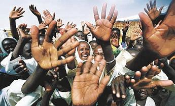 Niños sudaneses refugiados en el campo de refugiados de Abu Shok, cerca de El Fasher, en Darfur, Sudán, saludan con sus manos. Cerca de un millón y medio de personas, principalmente africanos musulmanes, ha buscado protección en campos de refugiados de Sudán, por temor a las milicias árabes anti-gubernamentales Yanyauid.